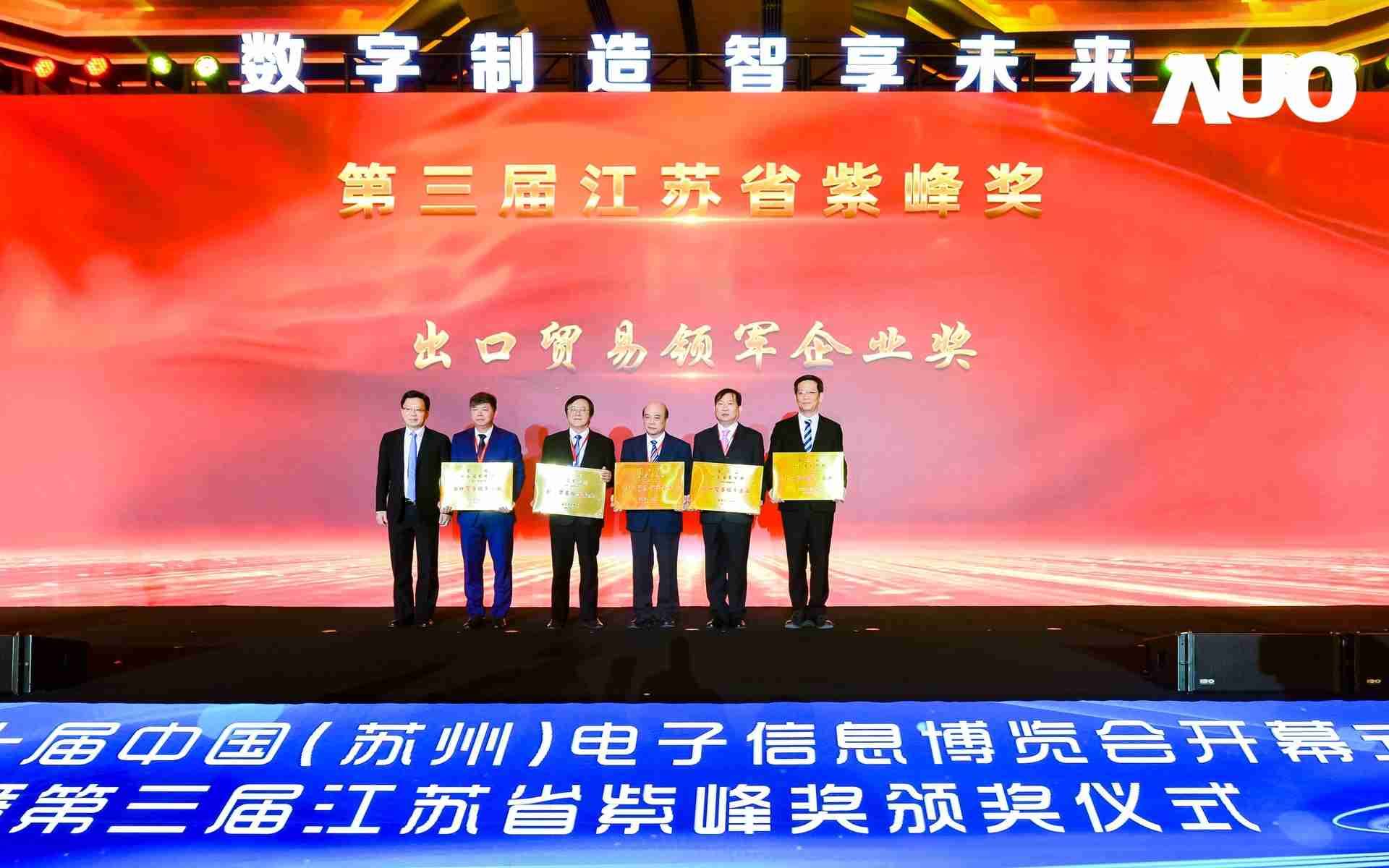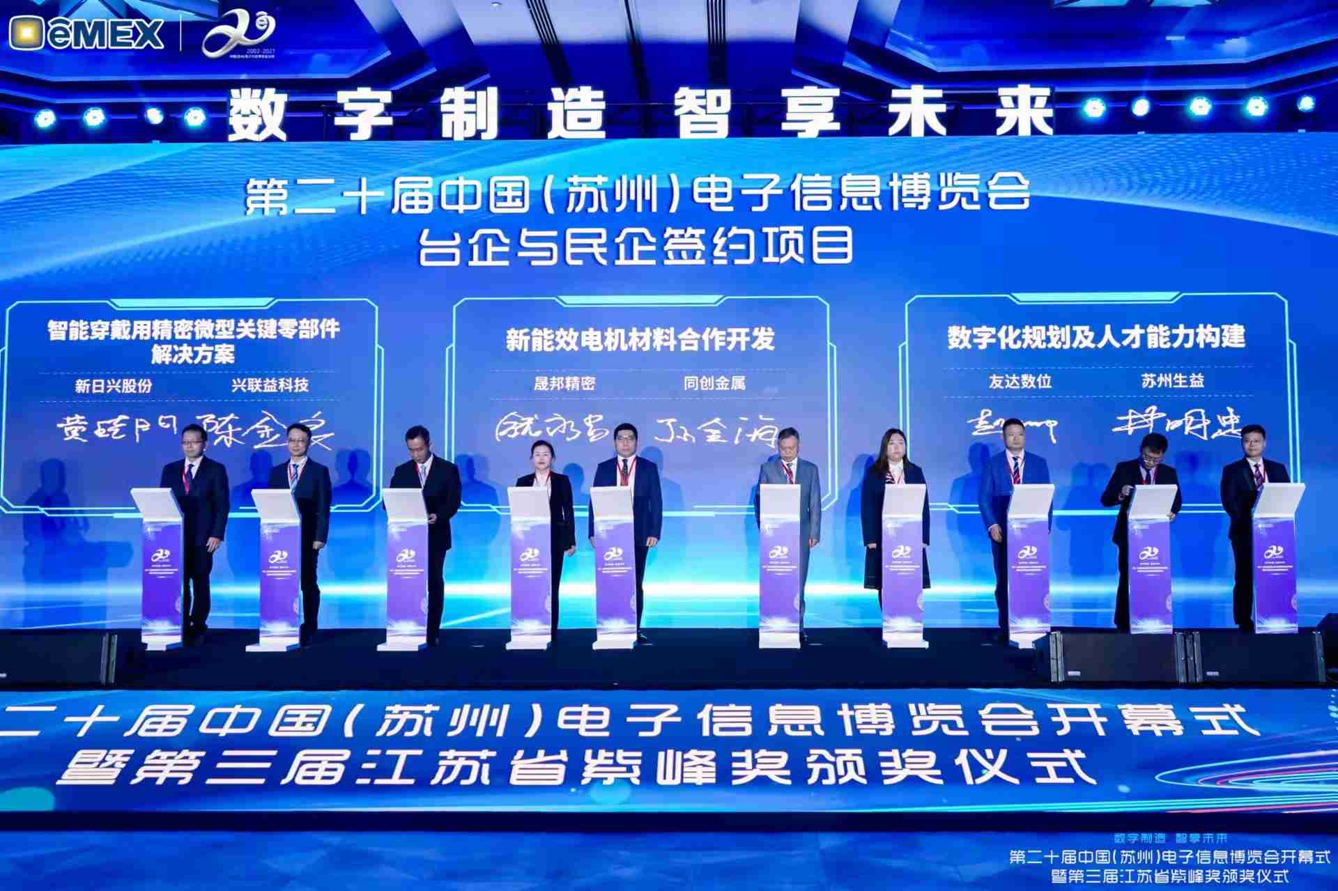 电博会开幕式当天也是第三届江苏省紫峰奖颁奖仪式,,,,省台办、、工信厅、、、商务厅、、苏州市相关领导均出席并颁奖。。。该奖项为表彰对江苏高质量发展做出积极贡献的在苏企业,,,由江苏省政府专门设立。。。。z6mg·人生就是博光电 (苏州) 总经理郭振明代表上台领奖,,这也是z6mg·人生就是博苏州连续三次蝉联紫峰奖 出口贸易领军企业奖。。。z6mg·人生就是博数位总经理赵丽娜女士,,,,也参与本次开幕式,,,,上台为本地化赋能签署战略合作协议,,,,将优质服务资源集合、、下沉到更多细分行业,,,为更多地区的制造企业提供数字化转型服务。。